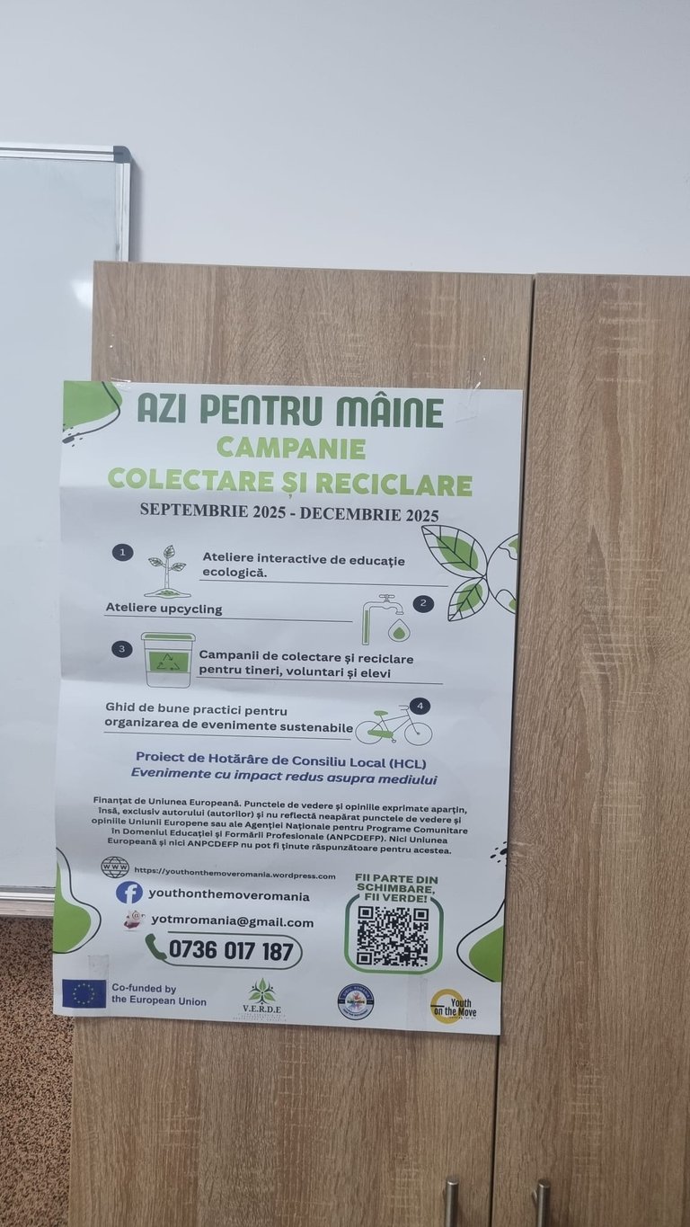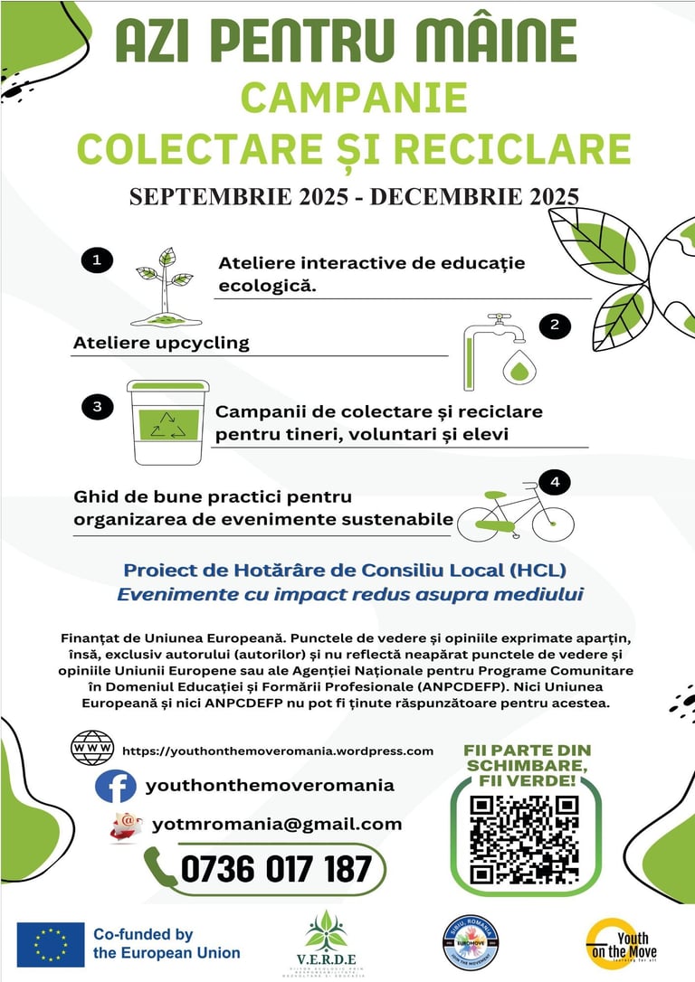 Asociația „Youth on the Move”, în parteneriat cu Asociația EUROMOVE NGO, desfășoară campaniile de colectare separată și reciclare în liceele partenere în cadrul proiectului V.E.R.D.E – Viitor Ecologic prin Responsabilitate, Dezvoltare și Educație, în perioada septembrie 2025 – decembrie 2025.