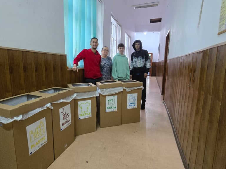 Fiecare clasă are o echipă de 2–3 elevi voluntari + profesor coordonator, care monitorizează containerele pentru deșeuri – plastic, hârtie, metal, sticlă, textile, notează cantitatea colectată și raportează periodic rezultatele.