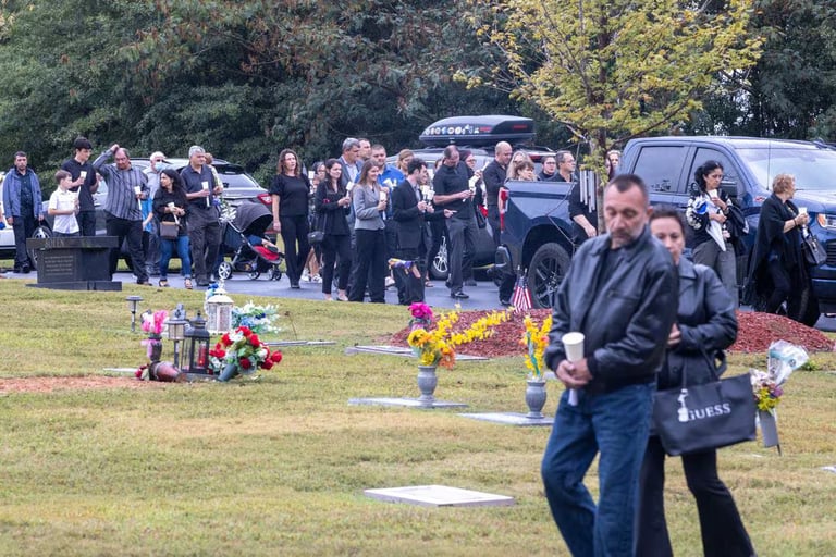 Sâmbătă, sub o ploaie ușoară în Buford, sute de oameni îmbrăcați în negru s-au adunat la mormântul profesoarei de matematică Ana Cristina Irimie de la Liceul Apalachee. În liniștea gravă, aceștia și-au pus mâinile pe umerii celor din jur și au cântat imnuri românești deasupra sicriului ei. Ceremonia, plină de tradiții ortodoxe românești, a fost condusă în mare parte în limba maternă a Anei, învăluită în cântări și rugăciuni. La final, tăcerea a cuprins mulțimea, care s-a apropiat încet de sicriu, presărând cu grijă pământ peste mormânt.