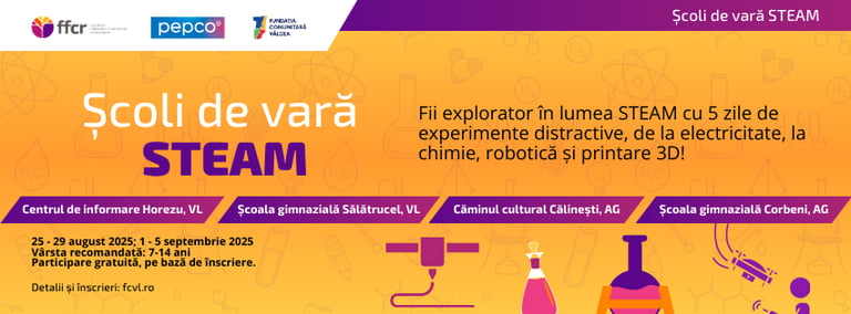 Fundația Comunitară Vâlcea anunță cu bucurie lansarea a patru Școli de Vară STEAM gratuite pentru copii, organizate în perioada 25 - 29 august, în localitatea Sălătrucel și în localitatea Horezu, în județul Vâlcea. În județul Argeș, școlile de vară se desfășoară la Călinești, în perioada 25 - 29 august și la Corbeni, în perioada 1 – 5 septembrie. Școala de vară de la Horezu se desfășoară în parteneriat cu Asociația Project IVI si grupul de inițiativă Digital Village. Activitățile sunt gândite să aprindă curiozitatea copiilor pentru știință, oferindu-le celor mici metode practice și distractive de a învăța noțiuni de știință, tehnologie, inginerie, artă sau matematică.