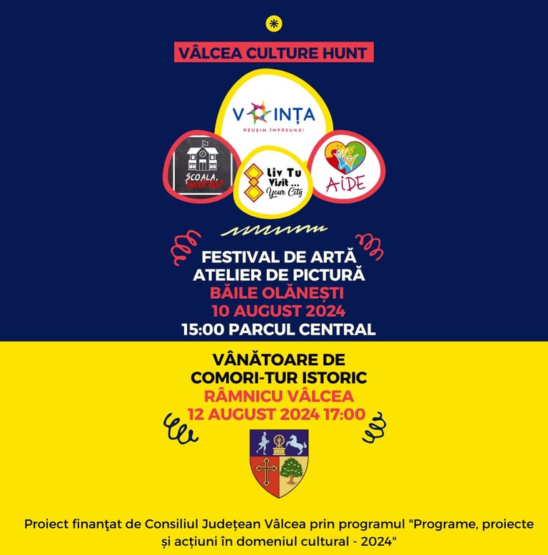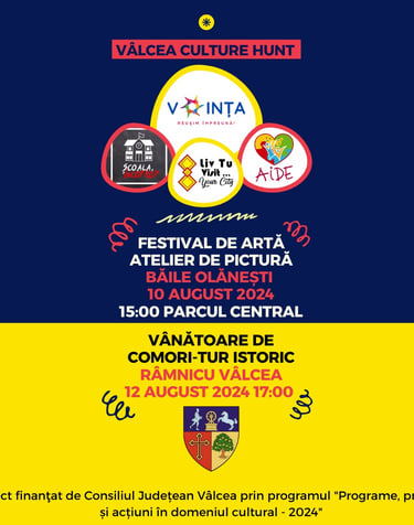 Asociația Voința anunță organizarea unui eveniment inedit. În perioada 10 – 12 August 2024 se va desfășura activități în proiectul “Vâlcea Culture Hunt”, finanțat de Consiliul Județean Vâlcea prin programul “Programe, proiecte și acțiuni în domeniul cultural 2024”.